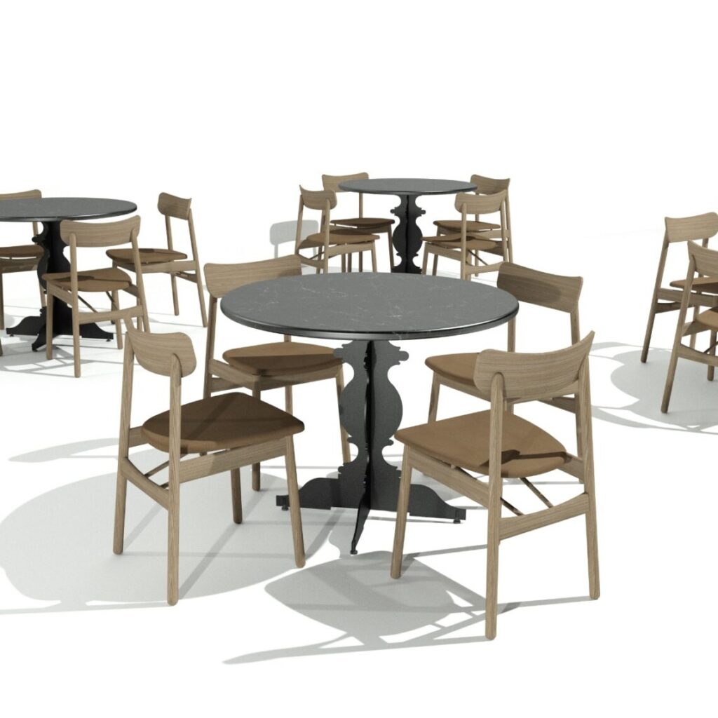 Además, su estructura compacta permite aprovechar mejor el espacio bajo la mesa, lo que mejora la movilidad de los comensales y del personal.